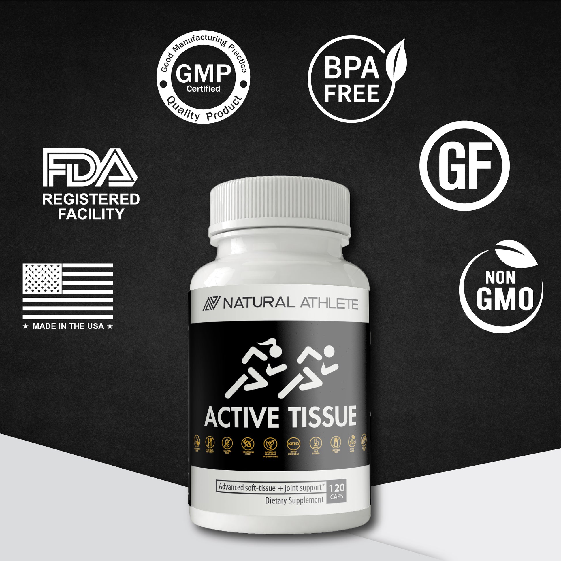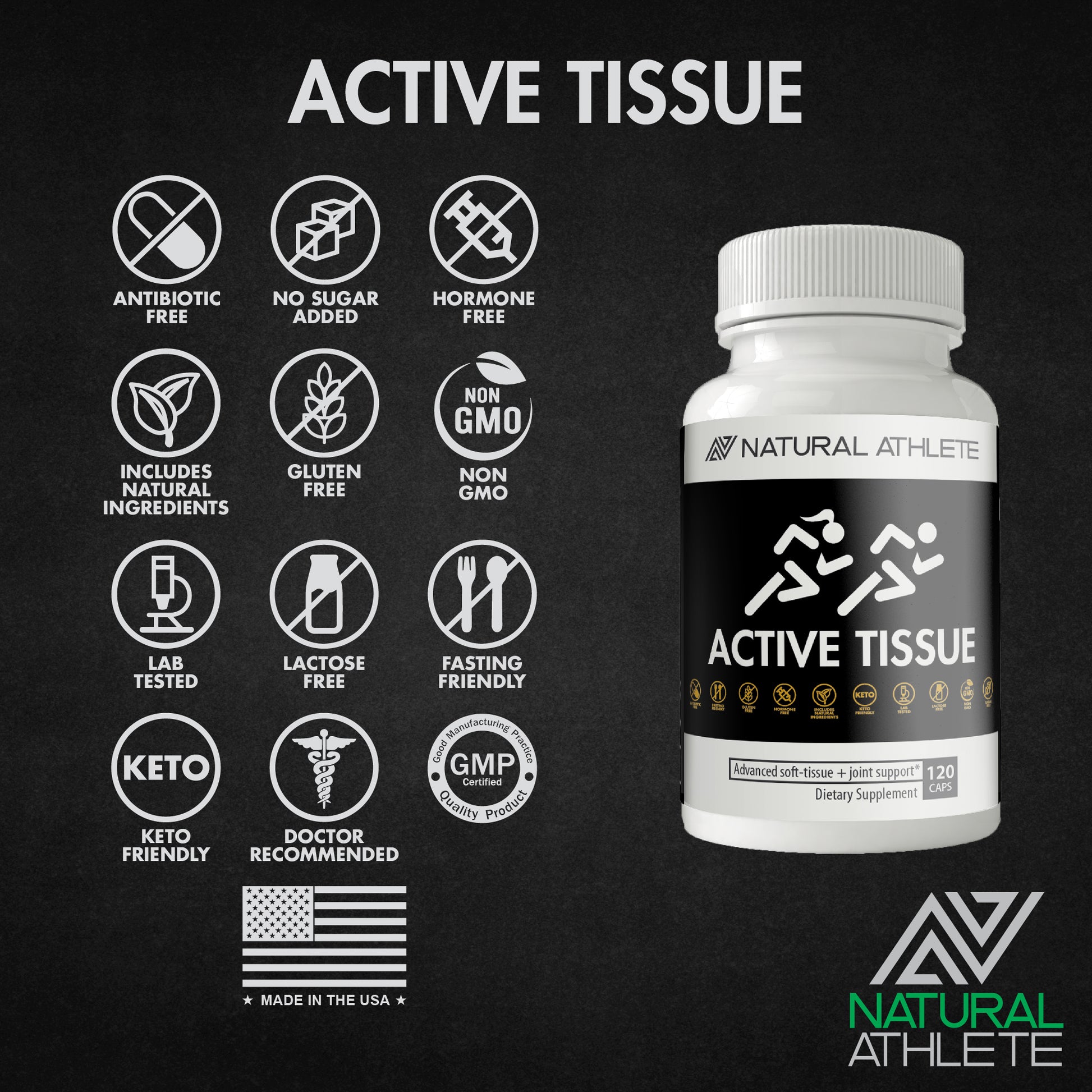 • Active Tissue is antibiotic-free, sugar-free, hormone-free, lactose-free, gluten-free, non-GMO, all-natural, vegetarian, vegan-friendly, keto-friendly, doctor-formulated, doctor recommended, lab-tested, FDA registered and made in the USA.