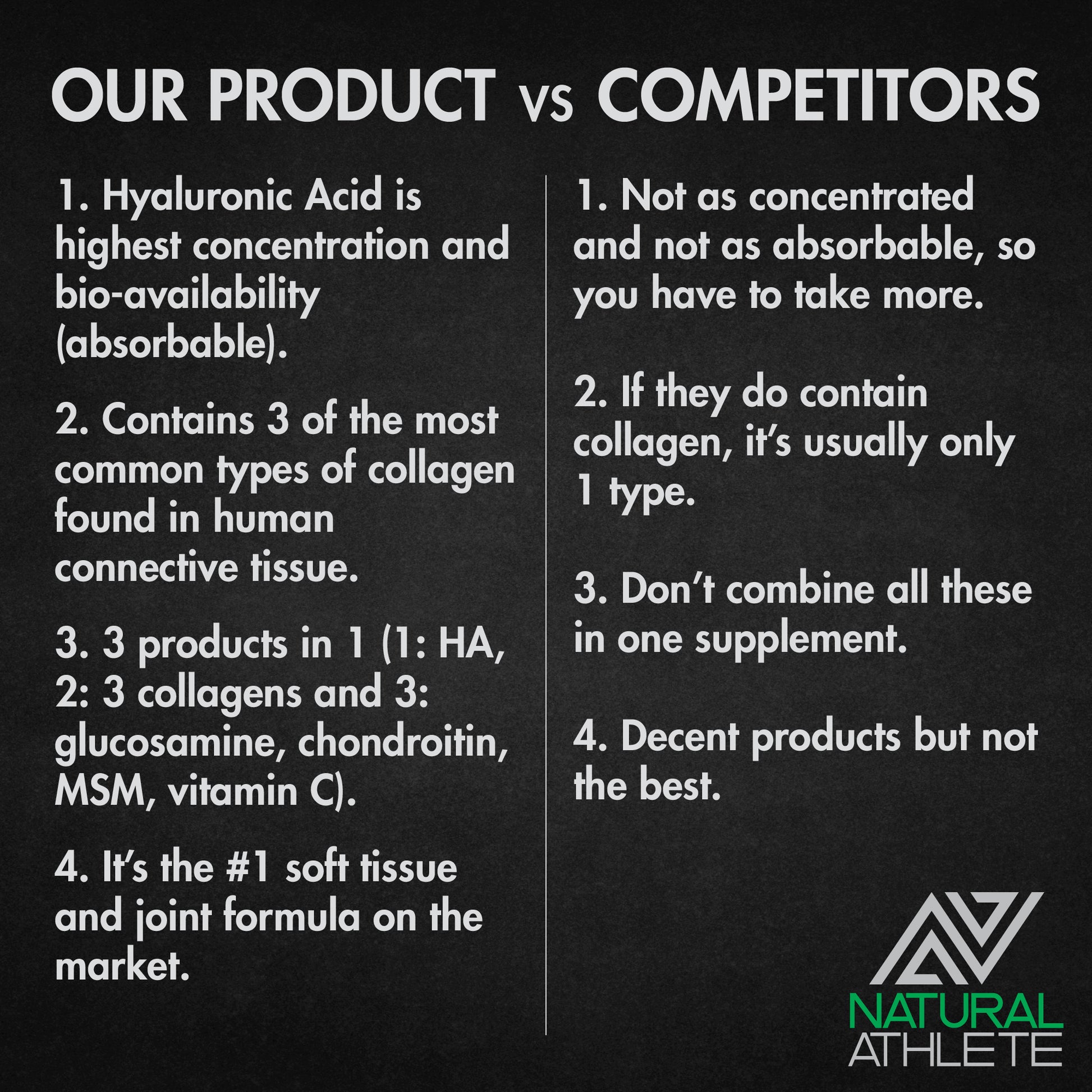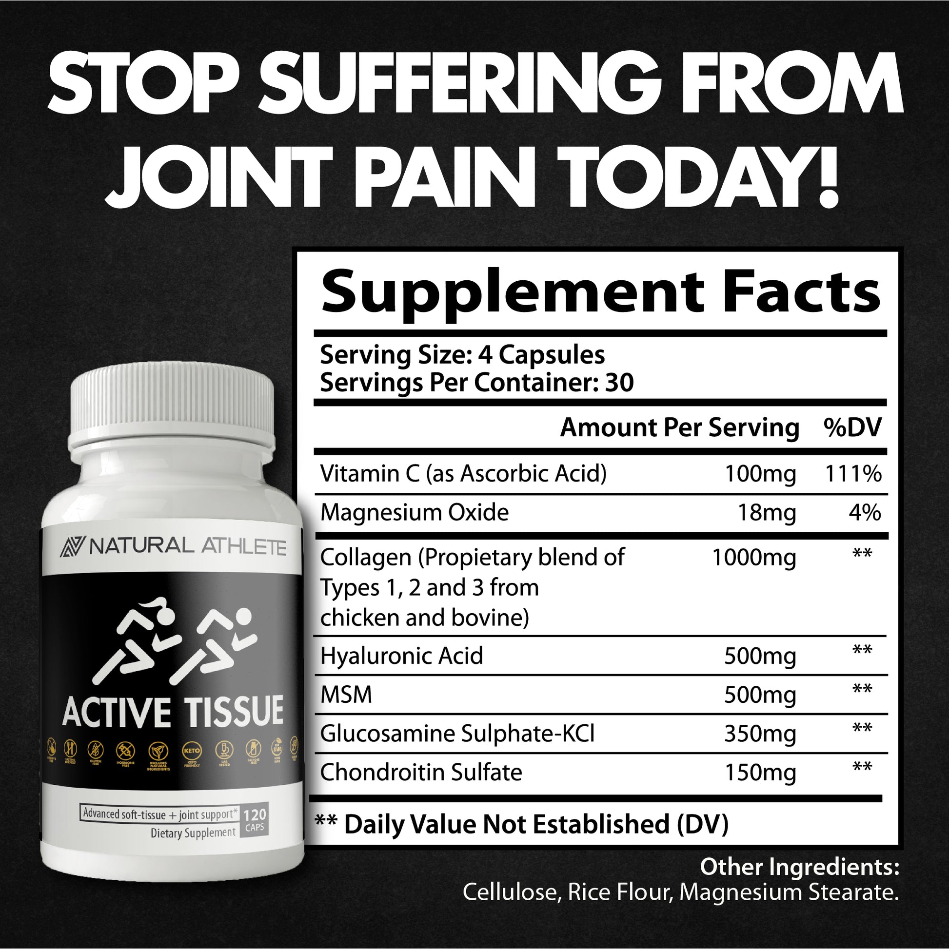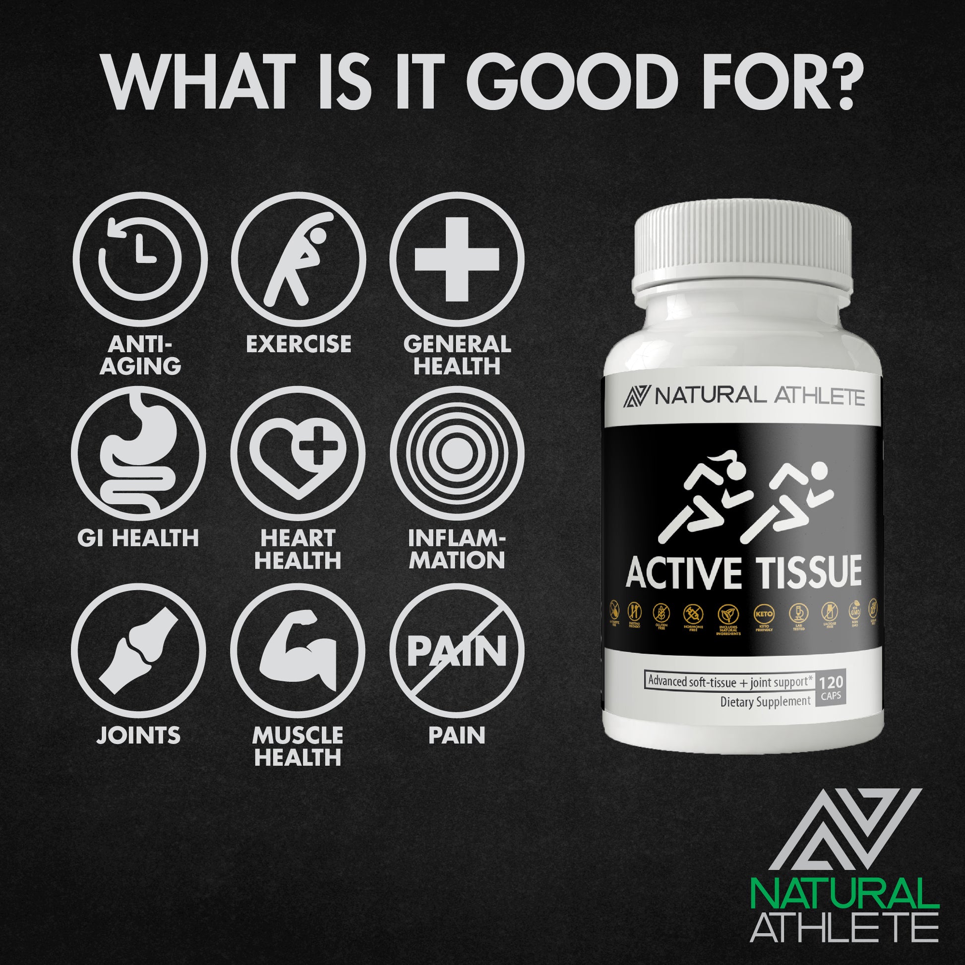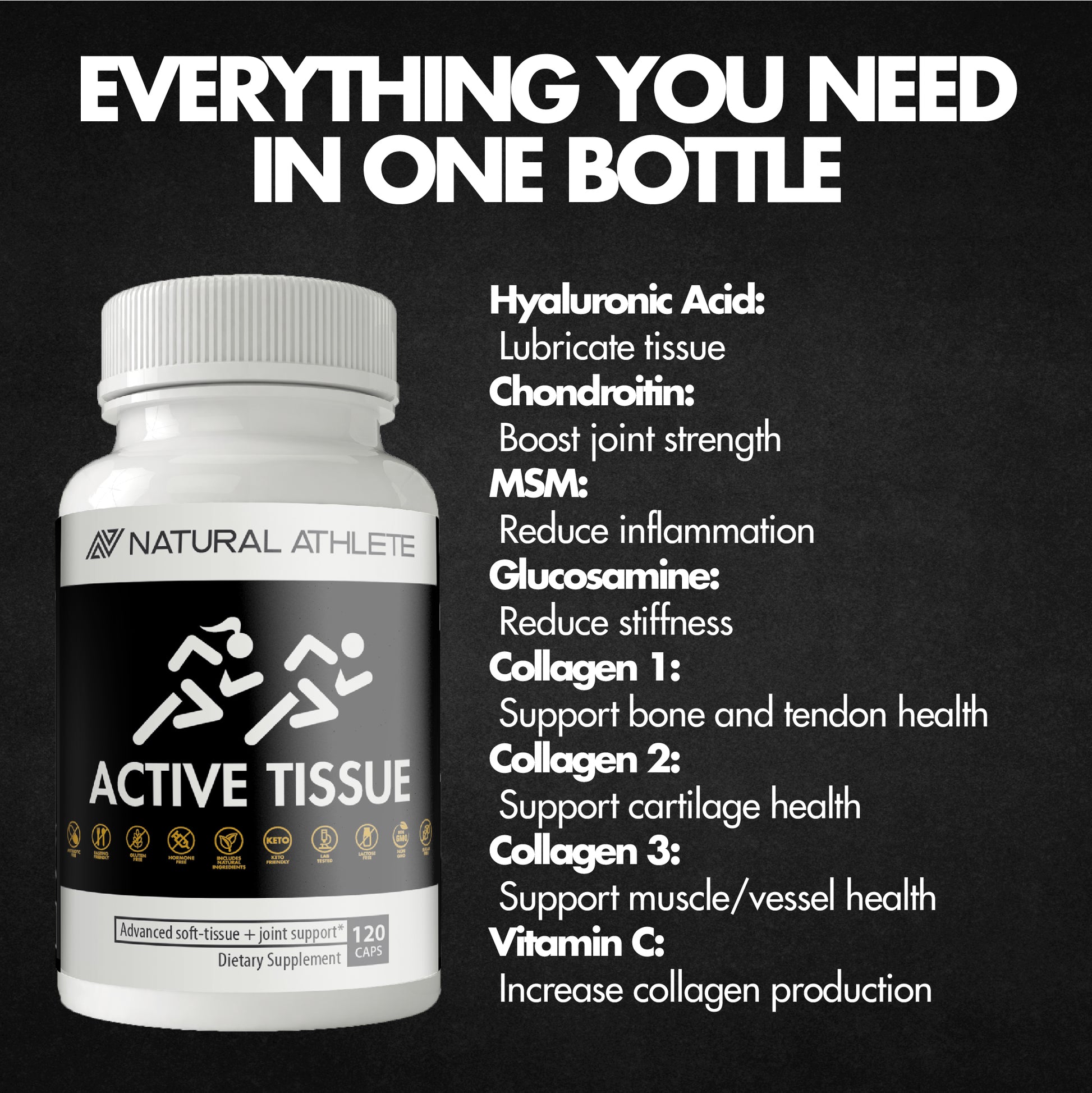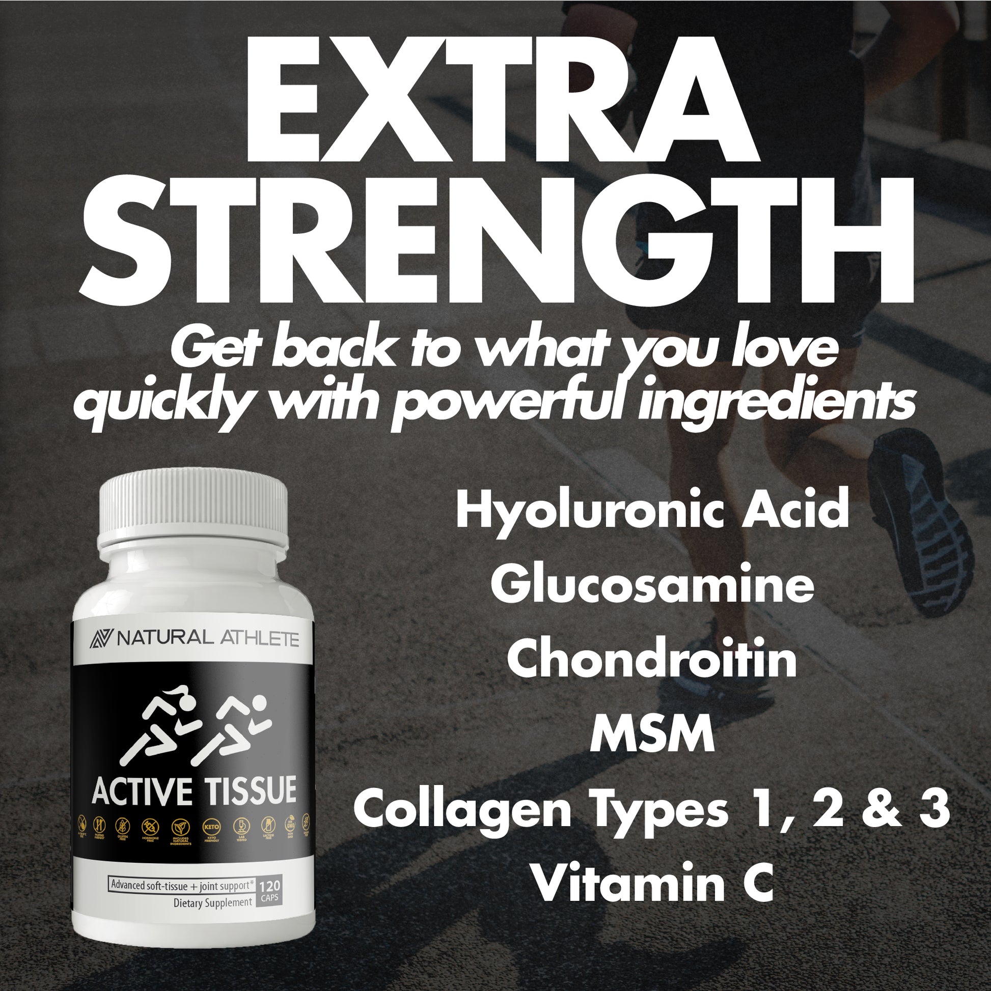 Whether you are an elite athlete looking to prevent future injuries, enhance your performance with the healthiest joints and tissues, or need to recover from intense training, Natural Athlete Active Tissue is the supplement that will take care of you. If you are suffering from arthritis, knee and back pain, or chronic joint stiffness and swelling, our Active Tissue blend will soothe the pain in as little as one week so you can get back to the action fast!