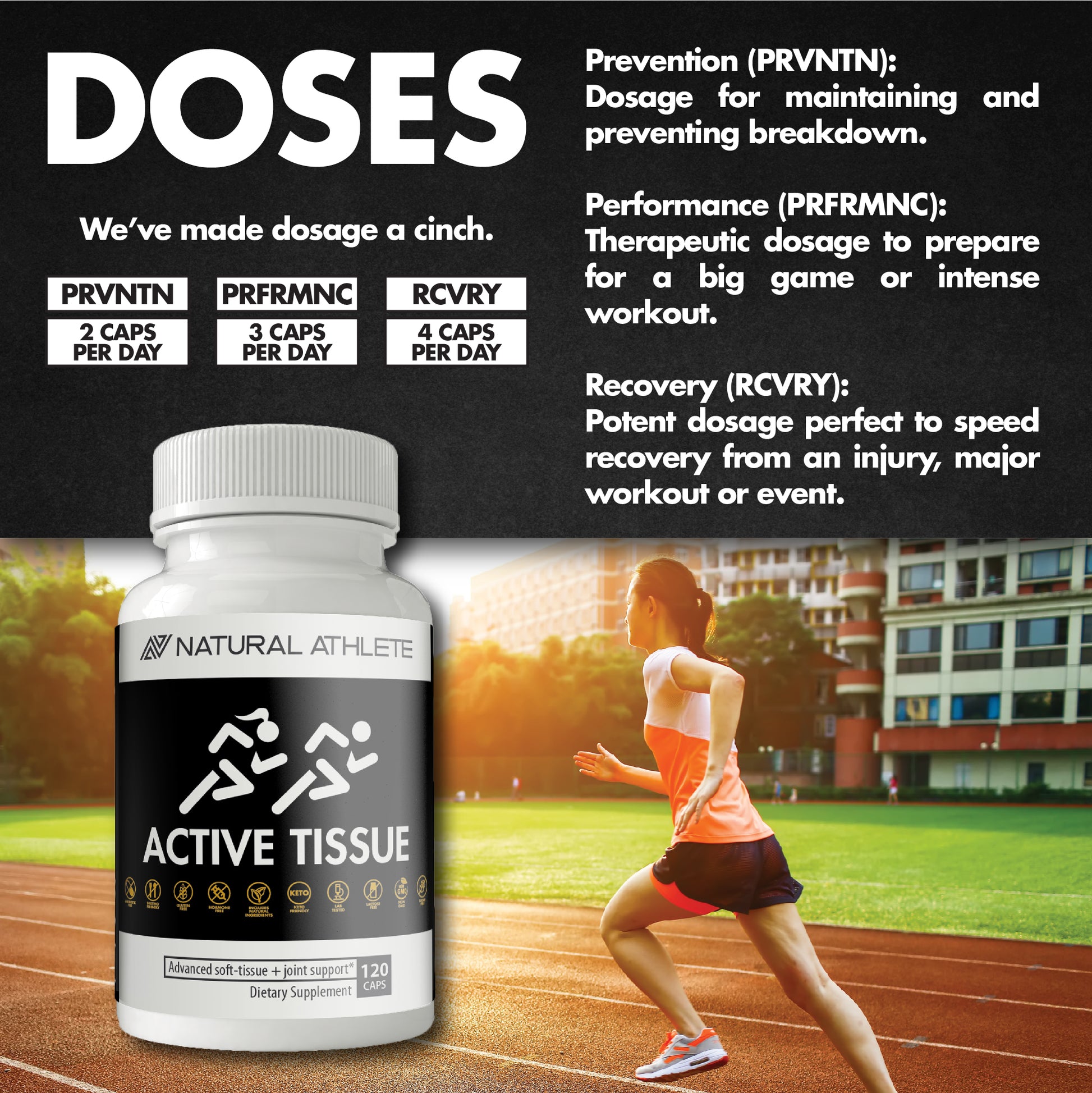 PRVNTN: this dosage is for those who have no symptoms and are aiming to optimize injury Prevention (PRVNTN).