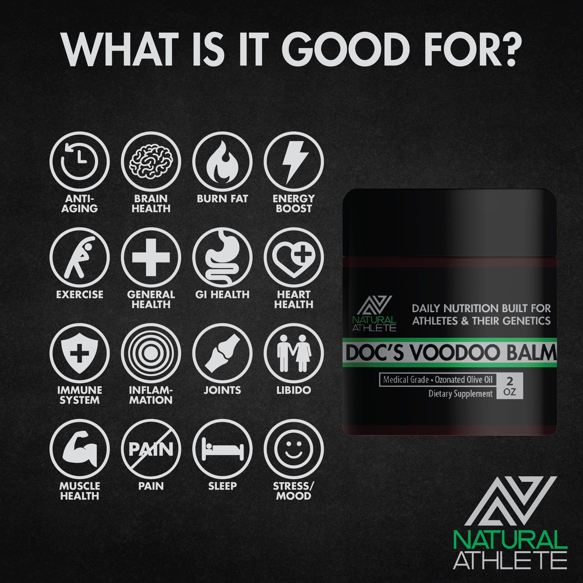 Doc’s Voodoo Balm is a 100% natural healing balm made by blending medical-grade ozone gas and organic cold-pressed extra-virgin olive oil. It works by oxygenating damaged tissues and stimulating the body's natural healing processes. Studies have shown ozonides produced by ozone in the body can increase ATP production in the mitochondria by up to 1,000%.
