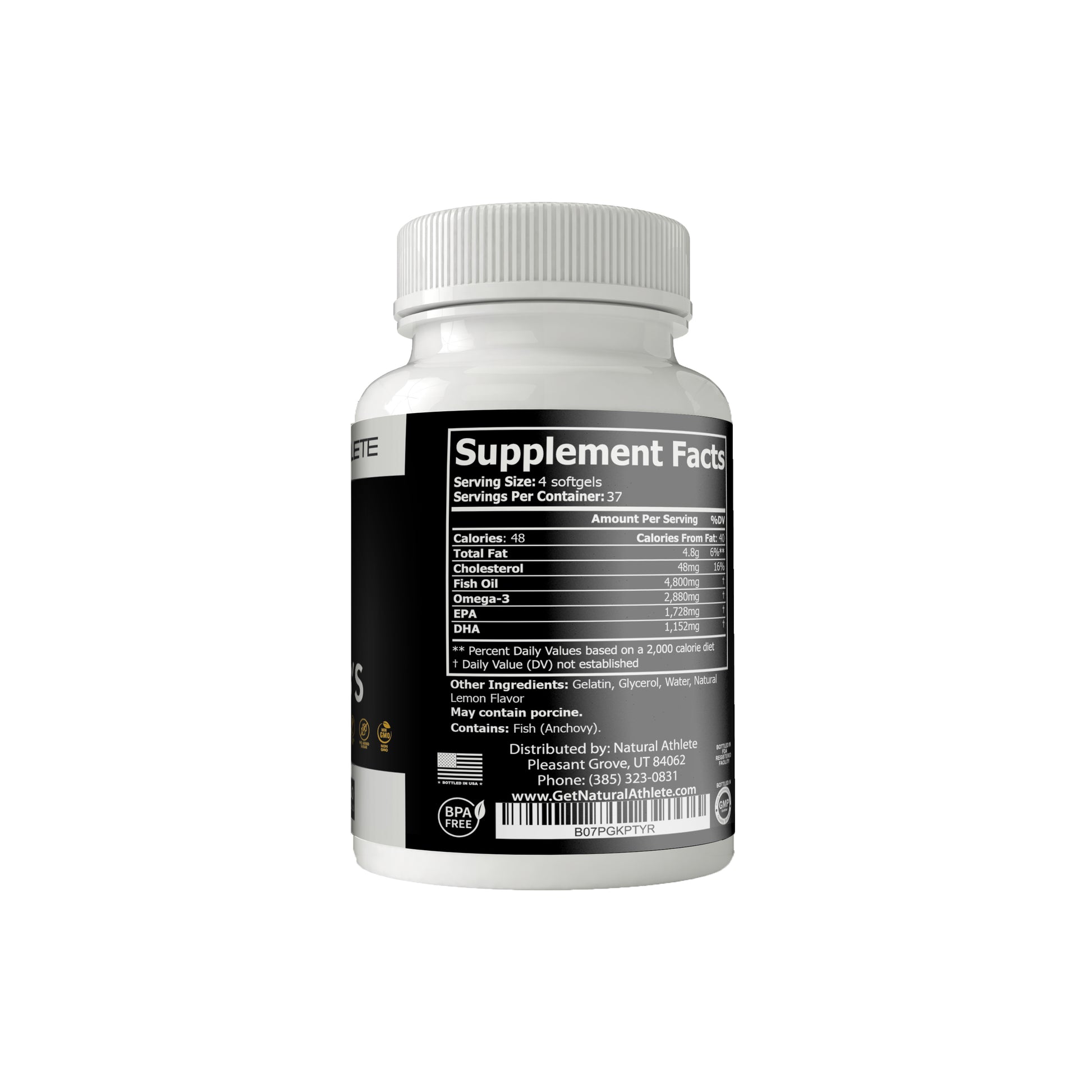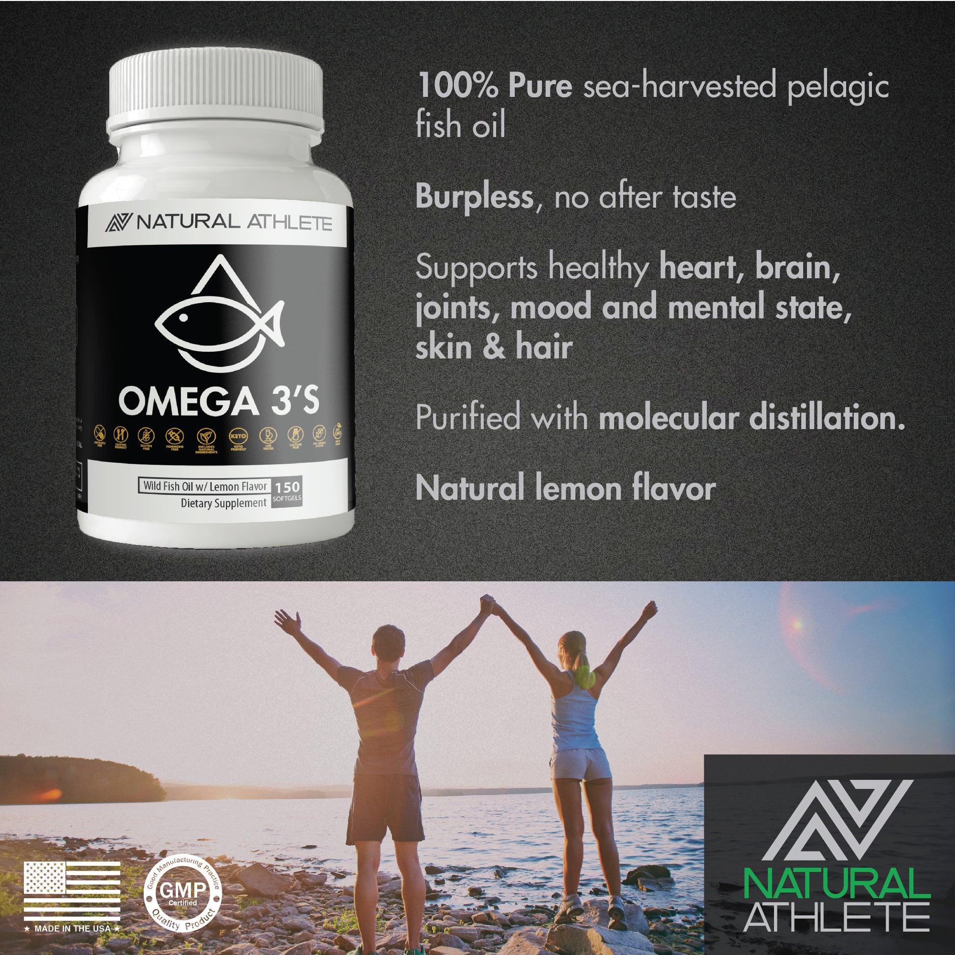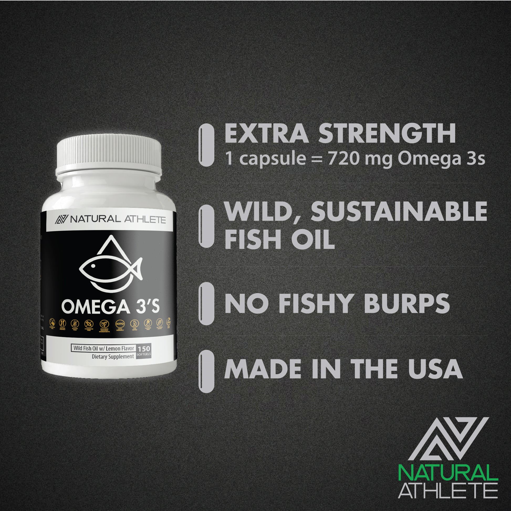 Natural Athlete's Omega 3's are made using only wild pacific-caught fish, which are sustainable and have fewer toxins. The supplement is also lab-tested for impurities, has lemon flavoring to prevent fish burps, and contains higher concentrations of EPA and DHA per gelcap, resulting in more potency and effectiveness.