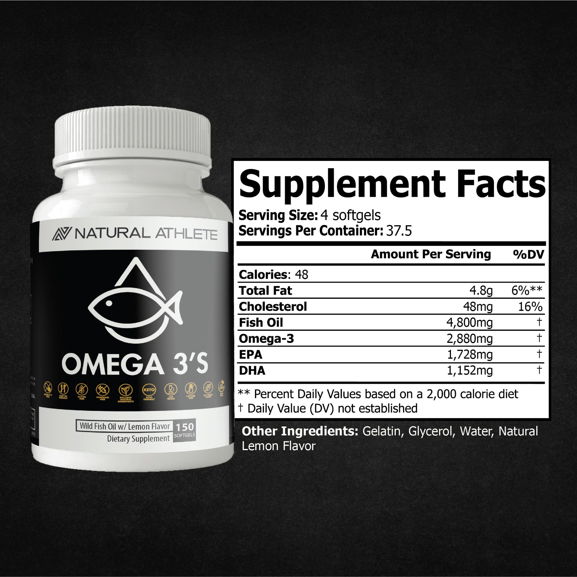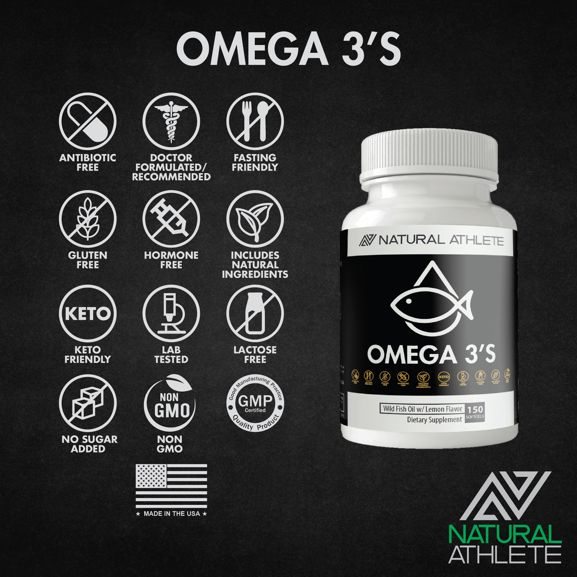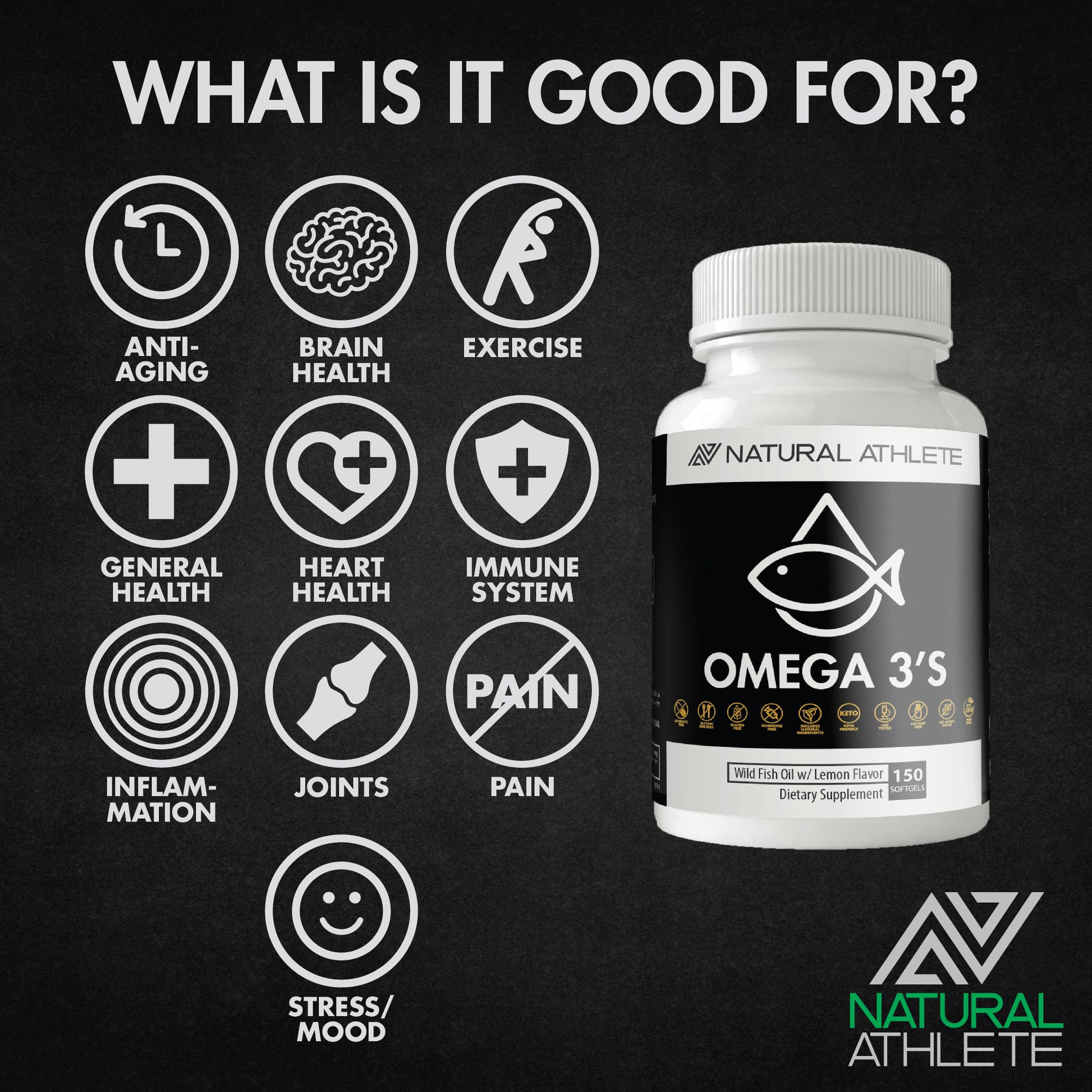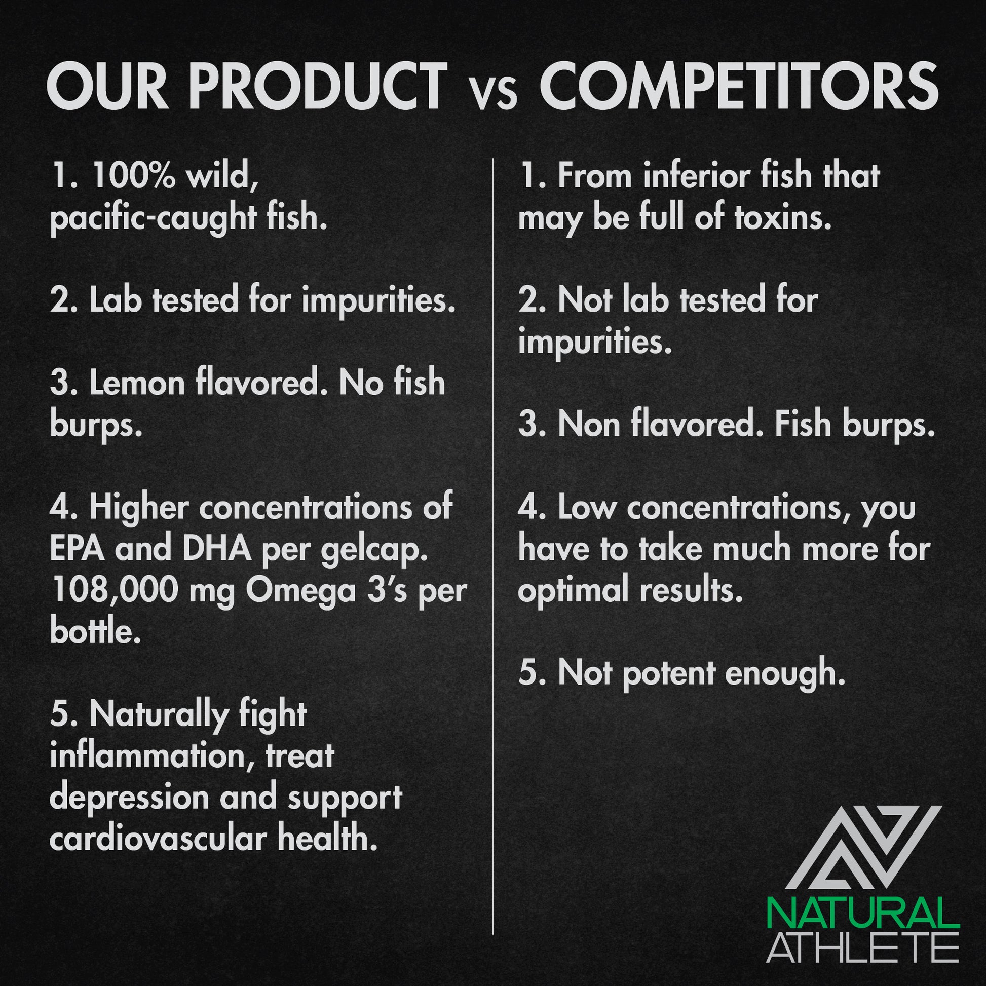 Natural Athlete's Omega 3's are made using only wild pacific-caught fish, which are sustainable and have fewer toxins. The supplement is also lab-tested for impurities, has lemon flavoring to prevent fish burps, and contains higher concentrations of EPA and DHA per gelcap, resulting in more potency and effectiveness.