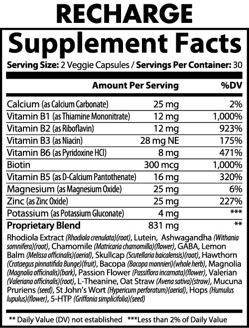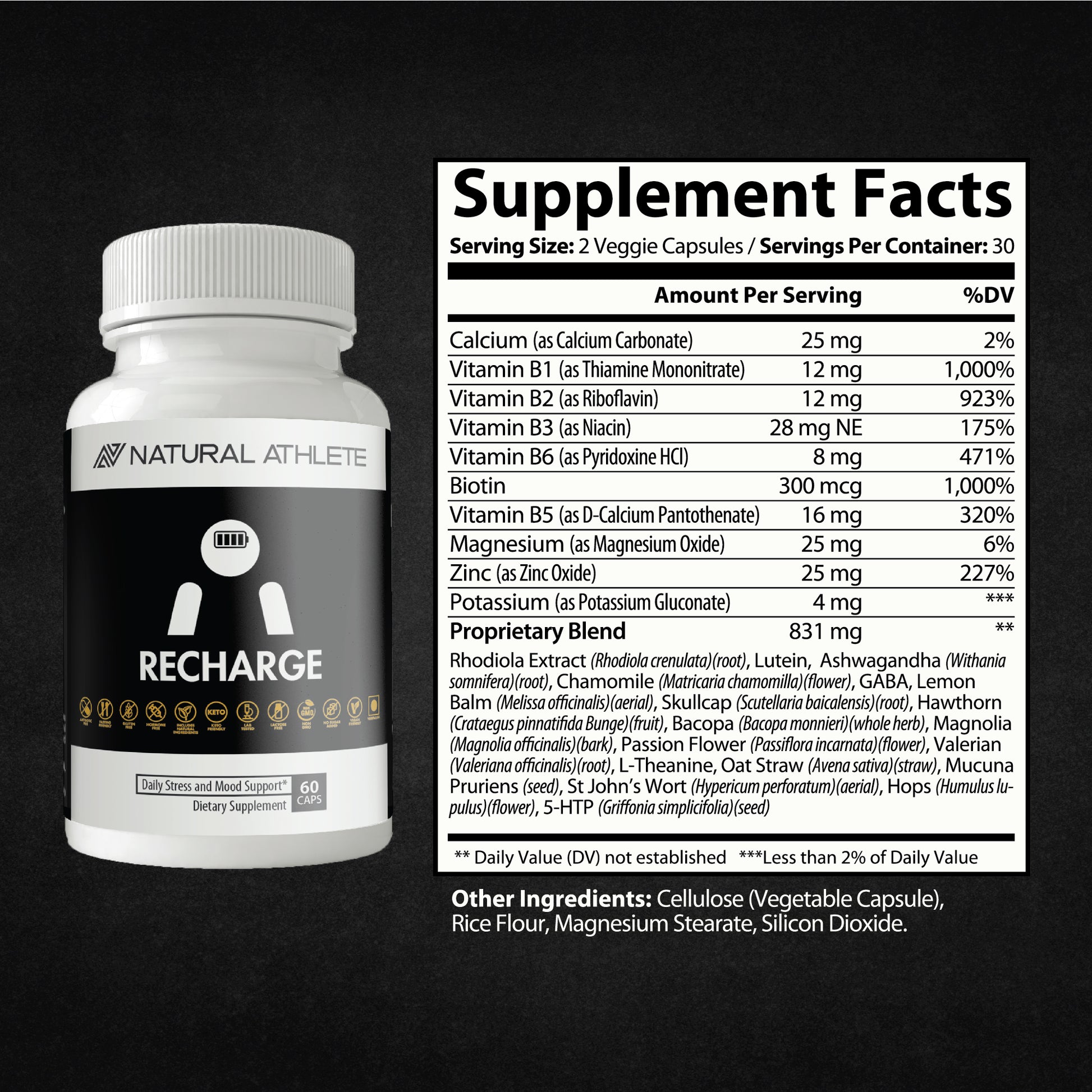 Recharge contains a unique blend of vitamins, adaptogenic herbs, amino acids, and minerals, including St. John's Wort, Lemon Balm, Ashwagandha, Rhodiola, Chamomile, Valerian Root, and Passion Flower.