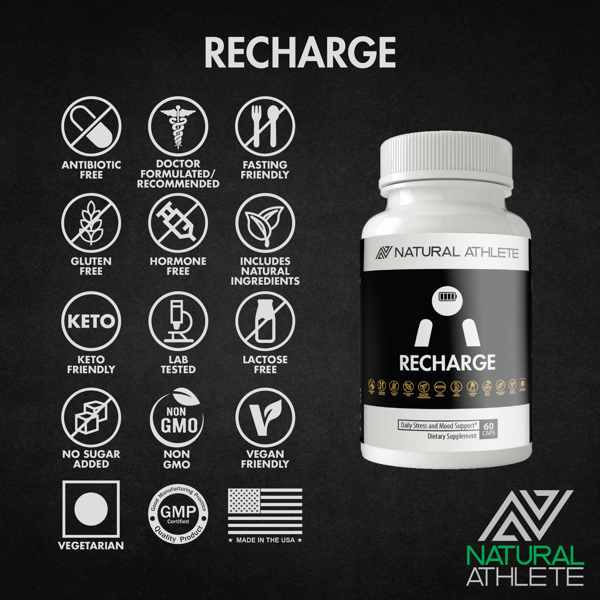 Recharge offers greater nutritional value than other supplements on the market by using a blend of adaptogenic herbs and scientifically balanced probiotics in a time-release capsule, to provide relief from all sources of stress, naturally increase serotonin and dopamine levels, and support the adrenal glands. Recharge is vegan-friendly, antibiotic-free, sugar-free, hormone-free, all-natural, gluten-free, non-GMO, lab tested, lactose-free, keto-friendly, fasting-friendly, vegetarian, doctor-formulated, doctor-recommended, and made in the USA.