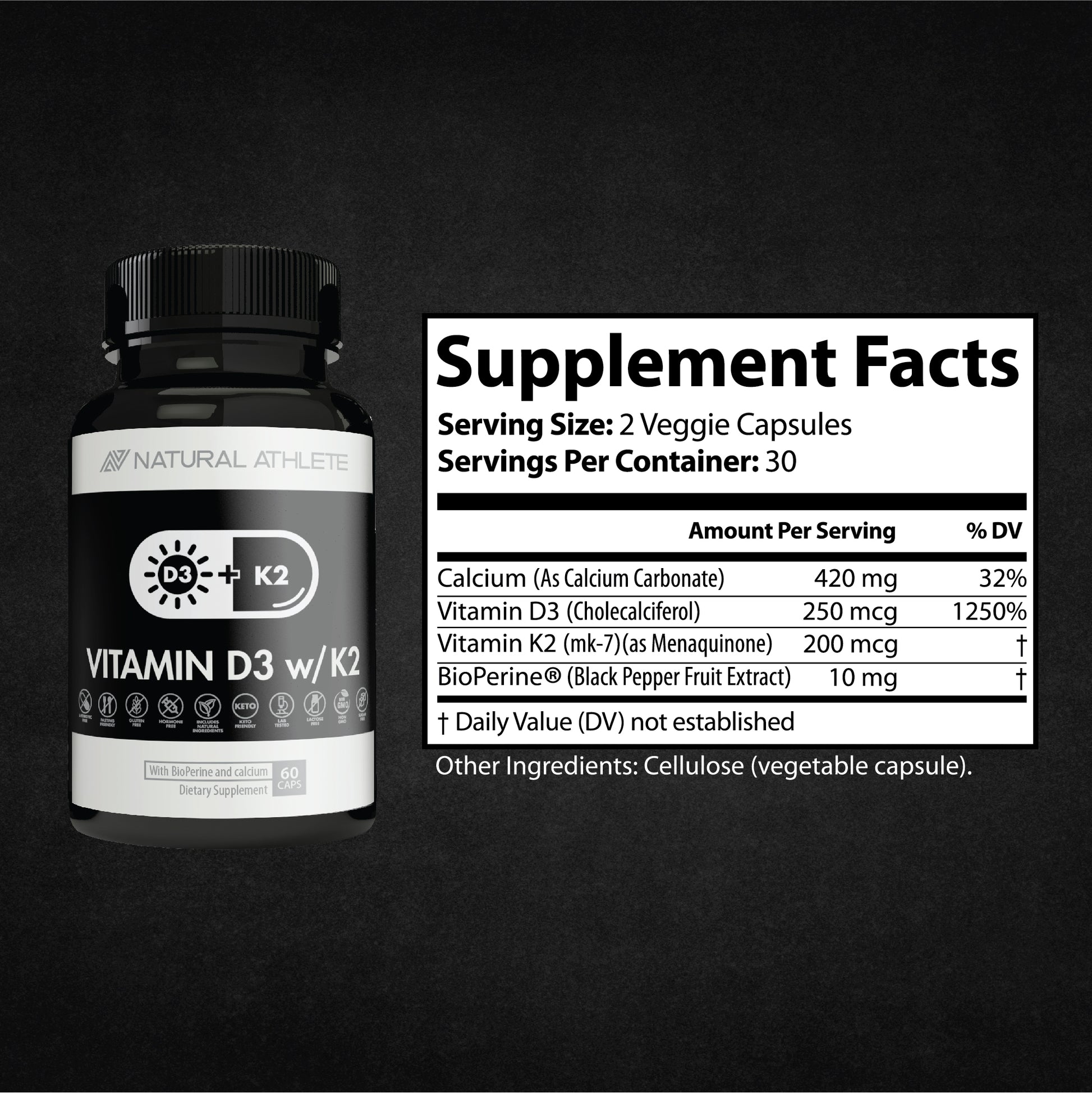 Natural Athlete's Vitamin D3 w/ K2 is the perfect supplement for athletes who want to maintain their health and performance. With the combination of these two essential vitamins, it helps to keep the bones and immune system strong, while also regulating calcium levels in the body. So whether you're training for a marathon or just trying to stay in shape, Natural Athlete's Vitamin D3 w/ K2 can help you reach your fitness goals. Grab yours now!